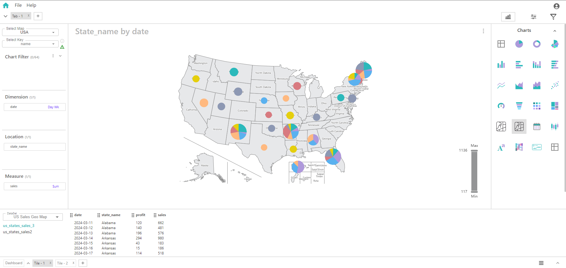 2. Defines the geographical context in which the data is plotted. This field determines the base map and the geographical areas where the bubbles are placed. The location field organizes the map into different regions or areas (e.g., countries, states, cities) where bubbles will be plotted. It represents the geographical boundaries within which the dimension and measure are analyzed.