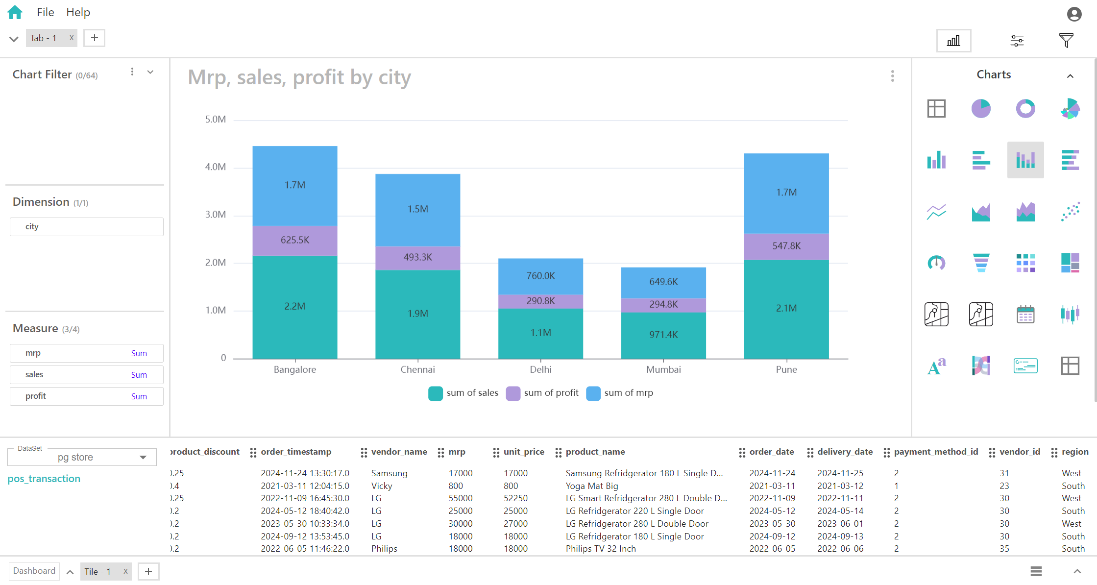 You can display a maximum of One Dimension and Four measures in your chart/table.